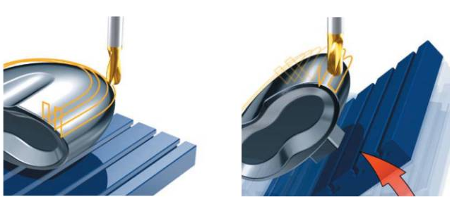 如上圖,在左圖中三軸切削方式,當切削刀具向頂端或工件邊緣移動時,切削狀態(tài)逐漸變差。而要在此處也保持最佳切削狀態(tài),就需要旋轉(zhuǎn)工作臺。而如果我們要完整加工一個不規(guī)則平面,就必須將工作臺以不同方向旋轉(zhuǎn)多次??梢钥匆姡遢S機床還可以避免球頭銑刀中心點線速度為0的情況,獲得更好的表面質(zhì)量。